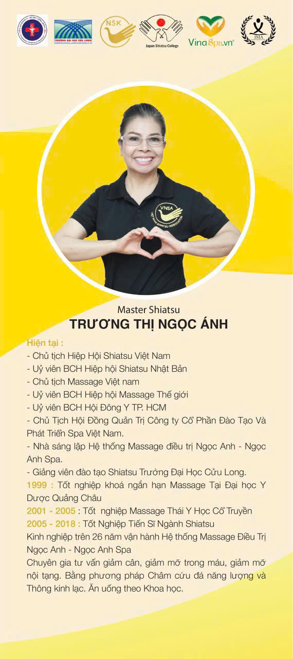 Khóa học hứa hẹn sẽ mang lại nhiều giá trị cho người tham gia, từ việc nâng cao sức khỏe cá nhân cho đến cơ hội nghề nghiệp đầy triển vọng. Với kinh nghiệm trên 25 năm quản lý và điều hành Hệ thống Massage Điều trị, chị là chuyên gia trong lĩnh vực đào tạo Chăm sóc khách và Tư vấn Quản lý Spa. Đồng thời, chị cũng được biết đến là Master về Shiatsu, chị Tu nghiệp về Shiatsu tại Nhật Bản và hiện đang là Chủ tịch Hiệp hội Shiatsu tại Việt Nam, cũng là tác giả của Shiatsu xuất bản bằng tiếng Việt.